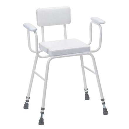 Perching stools allow the user close access to enable any task which could be done standing to be done from the stool e.g. bathroom basins, work surfaces, kitchen worktops and the like. Manufactured from high grade steel for sturdy stability. All models easily adjust in height with e-clips to accommodate different users and all have front to back bracing struts for additional strength. The splayed legs provide additional stability, and the seating area offers good support and is angled slightly forward for improved posture and ease of standing. The padded upholstery is made from foam covered with heat sealed PVC for comfort, they are waterproof and easy to wipe clean